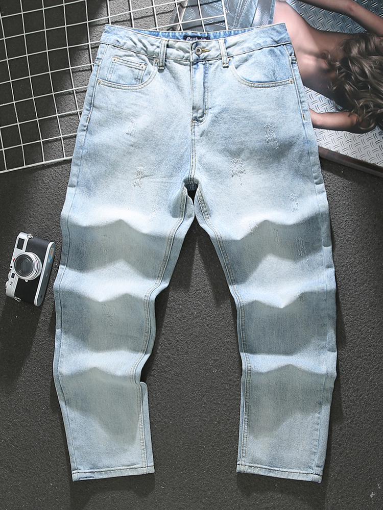 American washed distressed blue jeans for men 2023 new trendy cat scratched loose straight pants