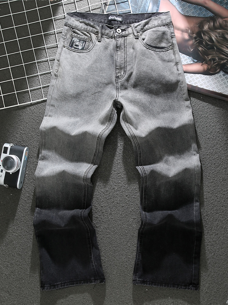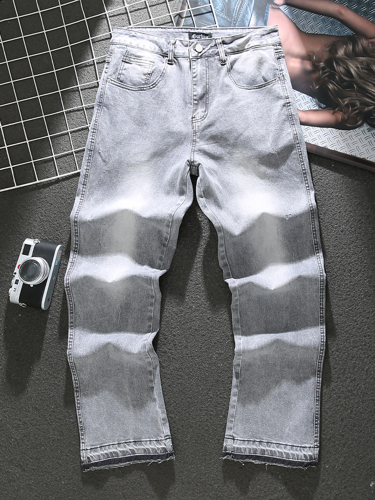 American distressed gray jeans for men in spring and summer new trendy loose straight leg washed trousers with raw edge splicing