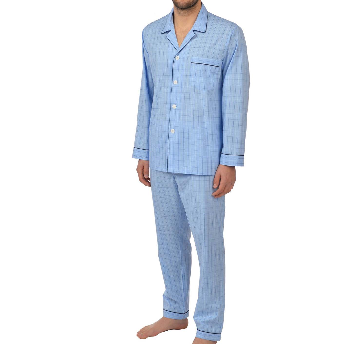 Our Light Blue Plaid pajama is the natural add-on to your pajama assortment in 100% cotton